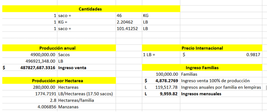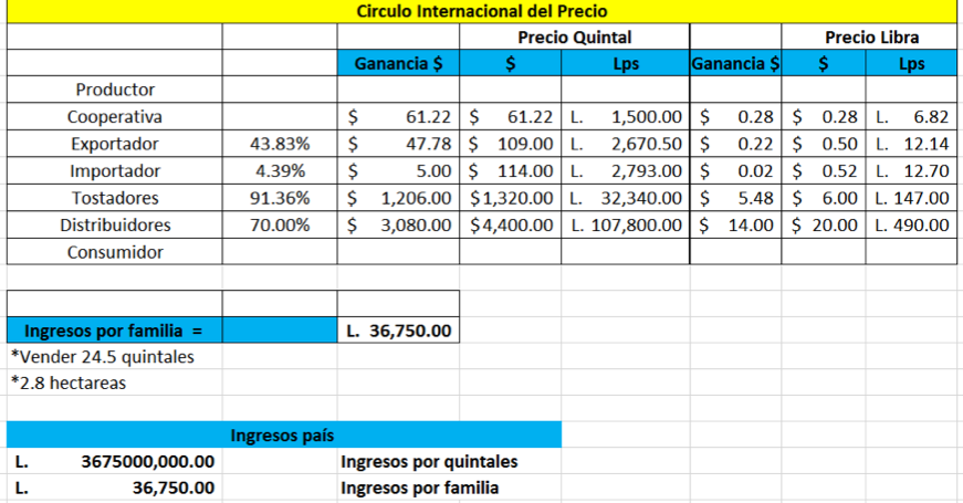 En esta investigación analizamos los datos proporcionados por el gobierno de Honduras e instituciones como IHCAFE para comprender de una manera más clara y hacer un aproximado de cuáles son los ingresos que perciben los caficultores en Honduras. Usando estos datos pudimos llegar a la conclusión que los productores (con un precio internacional de café de $0.9817 la libra, excluyendo los aranceles, costos de producción y de transporte, imaginando que los productores exportan directamente, teorizando que se venda la totalidad de la producción, y que los ingresos sean distribuidos igualitariamente entre las 100,000 familias por la igualitaria distribución de la tierra) perciben ingresos de Lps. 9,959.82 mensuales. Esto es inconcebible, cuando sabemos que la industria cafetalera genera ganancias millonarias.