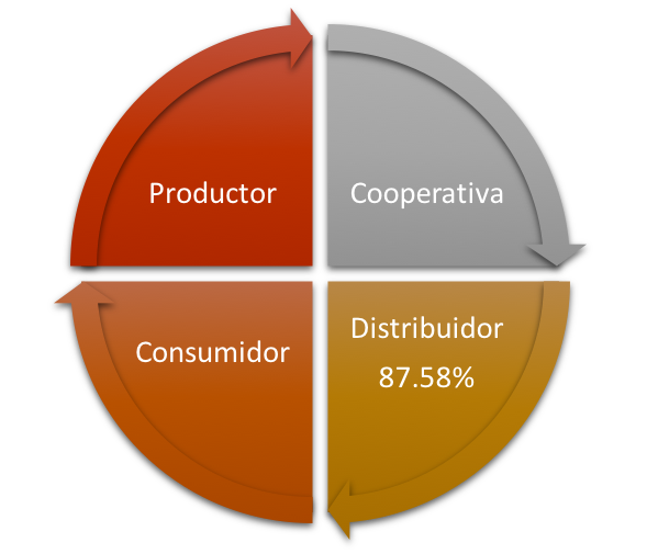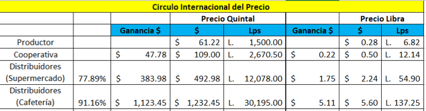 En este ámbito podemos ver que los distribuidores, en especial los restaurantes, son las que obtienen un beneficio de 91% de ganancia, es decir que ellos cobran una libra de café a Lps. 12.14 de las cooperativas y venden cada libra a Lps. 137.25 (estimando que por cada libra se hacen 8 tazas de café, y que el precio de una taza es de LPS. 20).
