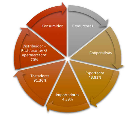 Al estudiar a profundidad los datos, podemos notar que las empresas tostadoras obtienen un poco más del 90% de ganancia, ya que obtienen los quintales de café de los importadores a un precio muy bajo comparado con el precio al que lo venden a los distribuidores (supermercados, restaurantes, cafeterías), luego vemos como estos distribuidores también obtienen ganancias del 70%. Todos estos altos precios los paga el consumidor final, los cuales nunca llegan a los primeros (productores) en el círculo de la venta de café.