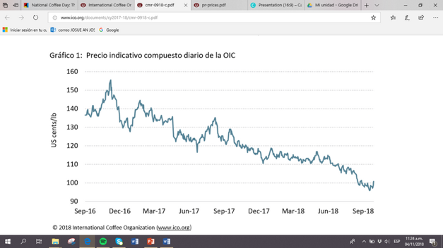 EL 20 de Septiembre del presente año se presentó la inquietud del precio del café ante la OIC “Los bajos precios del café a nivel internacional, la pérdida del valor de la cosecha y el impacto del cambio climático que ha incrementado plagas y enfermedades han llevado a cafetaleros de mesoamericana y el Caribe, entre estos de Honduras, a reunirse en Londres, para buscar alternativas que les permita mitigar esa problemática.”
