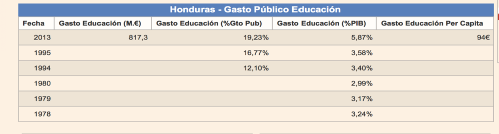 Simultáneamente a esta reducción del gasto público educativo ocurrió también una disminución importante en el flujo de los recursos externos para el sector. Debe destacarse que el aporte de la cooperación externa al sector educativo hondureño durante las últimas décadas ha sido amplio en montos y variada en las modalidades (tales como inversión en textos y otros materiales educativos, infraestructura escolar, capacitación de personal docente y administrativo, formación de capacidades técnicas y logísticas, etc.).
