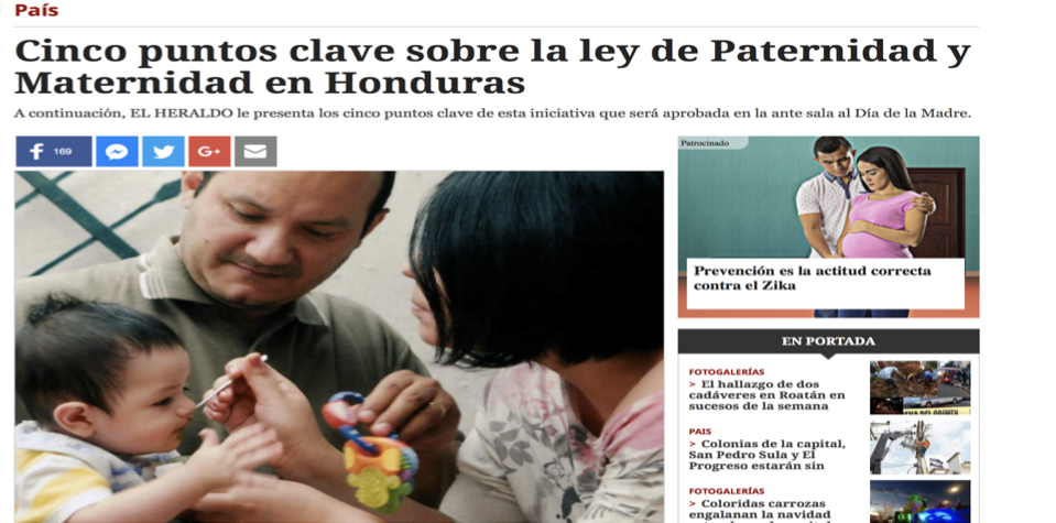 En Honduras en 2016 se dio una iniciativa de ley en la que se promovía el trabajo conjunto de los padres en criar a un bebe recién nacido brindándoles un ambiente familiar.