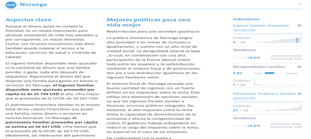 Aunque el dinero no puede comprar la felicidad, es un medio importante para lograr estándares de vida más elevados. En Noruega, el ingreso familiar disponible neto ajustado promedio per cápita es de 35 739 USD al año, cifra mayor que el promedio de la OCDE de 35 739 USD al año.
