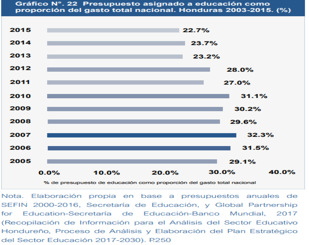 El presupuesto en educación como porcentaje del gasto total y el aporte de fuentes financieras externas. El financiamiento al sector educativo como porcentaje del gasto total también muestra una tendencia decreciente en el último quinquenio, es decir a partir del año 2011 comienza a descender, pasando de un 31. 1% en el año 2010 a un 22.7% para el 2015.